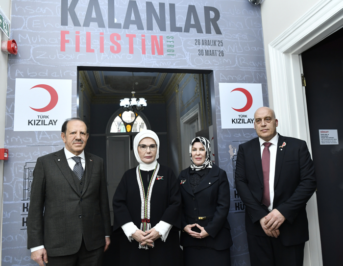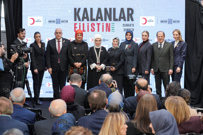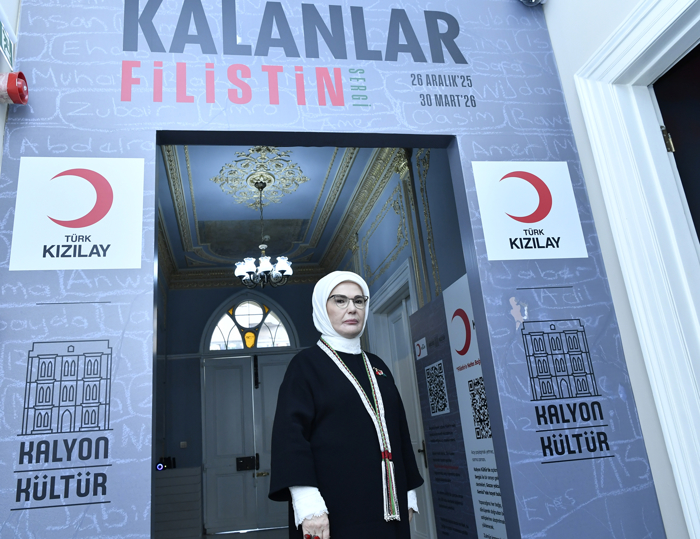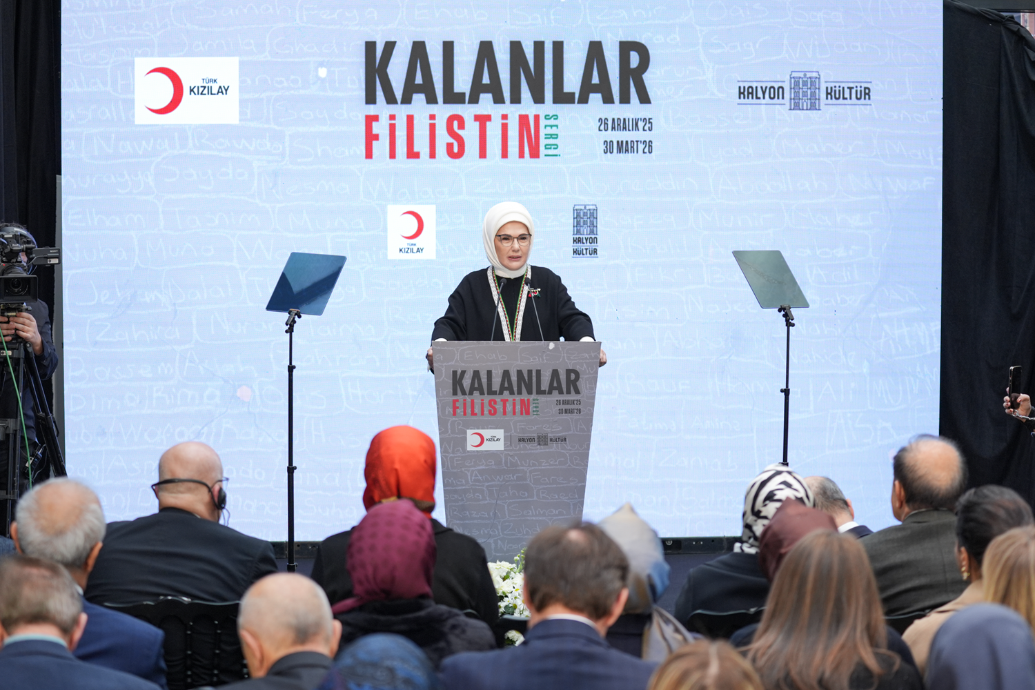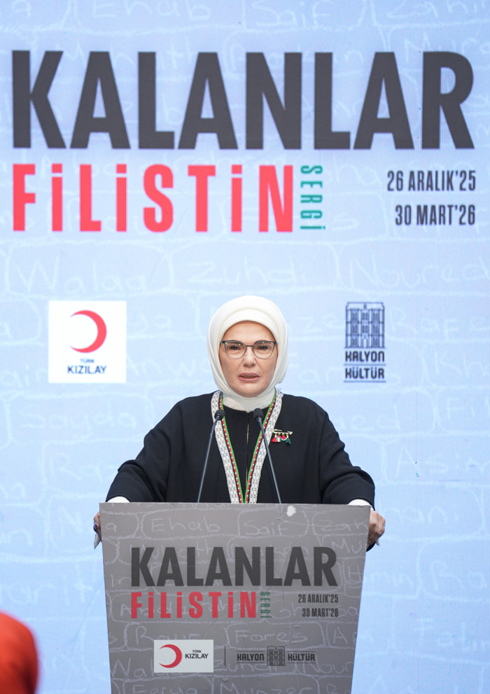 Emine Erdoğan, Kalyon Vakfı ve Türk Kızılay işbirliğinde, Gazze'de yıkımın içinden doğan vakur direnişi sanatın diliyle görünür kılma amacıyla Nişantaşı'nda Kalyon Kültür'ün bulunduğu Tarihi Taş Konak'ta düzenlenen "Kalanlar" Filistin Sergisi'nin açılışında konuştu.
