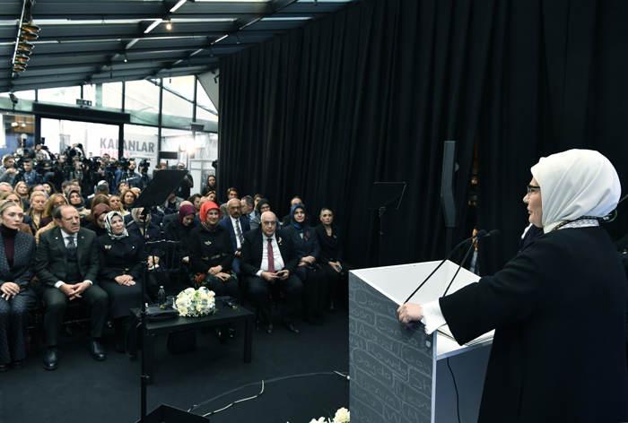 Emine Erdoğan, "Yüz ölçümü sadece 365 kilometrekare, yani aşağı yukarı Beykoz ilçesi kadar bir alan ama gelin görün ki bu avuç içi kadar yer, tarihin en kanlı, en vahşi, en sistematik soykırımıyla, hiçbir vicdanın kaldıramayacağı acıların merkezi oldu." diye konuştu.