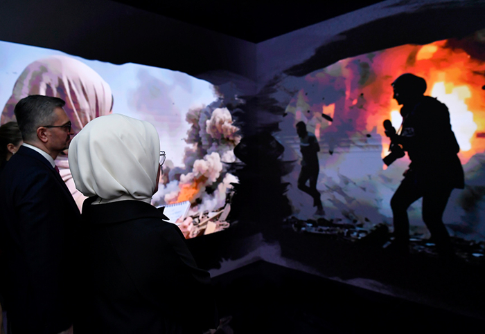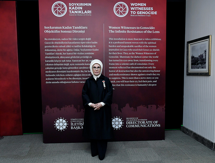 Cumhurbaşkanlığı İletişim Başkanlığına gelişinde Aile ve Sosyal Hizmetler Bakanı Mahinur Özdemir Göktaş ve Cumhurbaşkanlığı İletişim Başkanı Burhanettin Duran tarafından karşılanan Emine Erdoğan, İsrail'in Gazze'ye saldırılarında hayatını kaybeden gazetecilerin fotoğraflarının yer aldığı alanı gezdi.