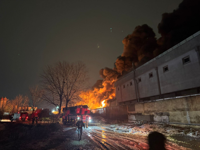 Esenyurt'ta bir kahve firmasına ait fabrikada çıkan yangına itfaiye ekipleri müdahale ediyor.