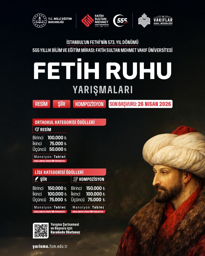 Fatih Sultan Mehmet Vakıf Üniversitesi ile Millî Eğitim Bakanlığı iş birliğinde düzenlenen “Fetih Ruhu” yarışması, öğrencileri İstanbul'un fethini kültür, sanat ve düşünce boyutlarıyla yeniden yorumlamaya davet ediyor. Türkiye genelinden öğrencilerin katılımına açık olan yarışmada toplam 1,5 milyon TL ödül sahiplerini bulacak. Yarışma, gençleri tarih bilinci ve medeniyet perspektifi çerçevesinde üretim yapmaya teşvik ediyor.