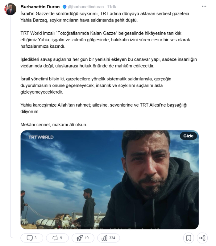 TRT'nin Gazze'deki serbest çalışanı, gazeteci Yahia Barzaq katil İsrail'in saldırısında şehit düştü. İletişim Başkanı Burhanettin Duran, Gazze'de işgalci İsrail saldırılarında şehit olan Gazeteci Yahia Barzaq hakkında duygulandıran bir paylaşım yaptı. Duran, Barzaq'ın işgalin ve zulmün gölgesinde, hakikatin izini süren cesur bir ses olarak hafızalarımıza kazındığını belirtti.