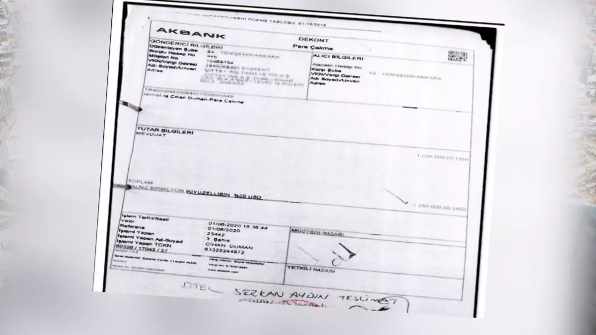 Savcılık bahsi geçen rüşvet parasının dekontlarını da iddianameye koydu. Dekontlarda Çiftay İnşaat A.Ş. adlı firma tarafından 1 Haziran 2020'de Akbank Ankara Yenişehir Şubesi'ne Cihan Duman adına 1 milyon 250 bin dolar ödenmesi yönünde talimat olduğu görüldü. Delil olarak dosyaya giren diğer dekontta ise aynı tarihte bankadan Cihan Duman isimli şahsa 1 milyon 250 bin dolar tutarında ödeme yapıldığı görülü.