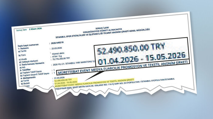 İstanbul Spor Etkinlikleri ve İşletmeciliği AŞ, "2026 İstanbul Yarı Maratonu Organizasyon Hizmeti Alımı" ihalesini davet usulüyle 52 milyon 490 bin TL bedelle Mürettebat Event Fuarcılık AŞ'ye verdi.