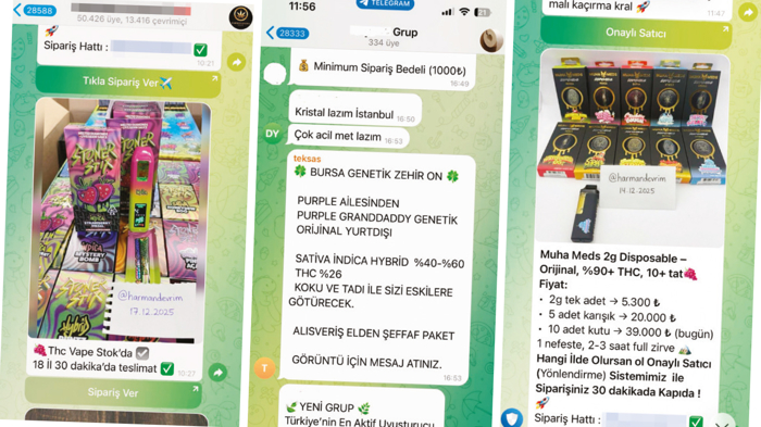 AKŞAM Gazetesi'nin haberine göre, Yüksek THC oranına sahip olduğu belirtilen tek kullanımlık vape cihazlarının, Telegram üzerinden 'onaylı satıcı' iddiasıyla paylaşılıyor. İlanlarda "30 dakikada kapıda", "tek nefeste saatlerce etki" gibi ifadeler yer alıyor. Satıcılar WhatsApp üzerinden müşteriler ile iletişim kurabiliyor.