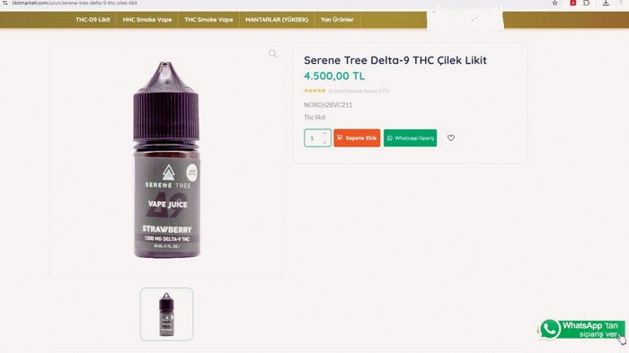 Bazı internet sitelerinde 'Delta-9 THC' ibaresi taşıyan vape likitlerinin ürün fotoğrafları, aromaları ve fiyatlarıyla birlikte listelendiği görüldü. Söz konusu ürünlerin bazı sitelerde sepet sistemine eklenerek, bazılarında ise doğrudan mesajlaşma uygulamaları üzerinden siparişe açıldığı dikkat çekiyor. Telegram'da çilek, karpuz ve vanilya gibi aromalarla pazarlanan THC likitleri için 'en çok satan' etiketi de kullanılıyor. Yüksek THC oranına sahip olduğu belirtilen tek kullanımlık vape cihazları da yine bu platformlarda satışa sunuluyor.