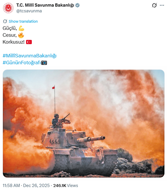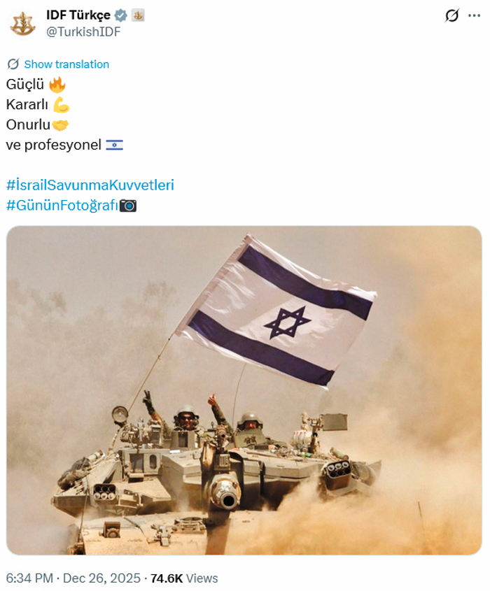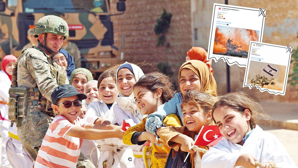 İsrail Savunma Kuvvetleri'nin Türkçe hesabı, Milli Savunma Bakanlığı'ndan (MSB) sonra aynı paylaşımı yaptı. MSB'nin sosyal medya hesabından yapılan paylaşımda, Türk ordusuna ait bir tank ve Türk askerinin fotoğrafına yer verilirken "Güçlü, cesur, korkusuz" ifadesi kullanıldı. Paylaşımın ardından İsrail Savunma Kuvvetleri'nin Türkçe hesabından aynı paylaşım yapıldı. IDF Türkçe hesabından, "Güçlü, kararlı, onurlu ve profesyonel" notuyla yapılan paylaşım tepki çekerken, İsrail'in içinde bulunduğu ruh halini ortaya koydu. İsrail'in tepki çeken paylaşımına MSB'den tokat gibi cevap geldi. MSB, halat çekme yarışı yapan Türk askerini ve Suriyeli çocukları paylaştı. Paylaşımda da "Güç silahta değildir! Asıl güç, masumların size duyduğu güvendir" ifadeleri yer aldı.