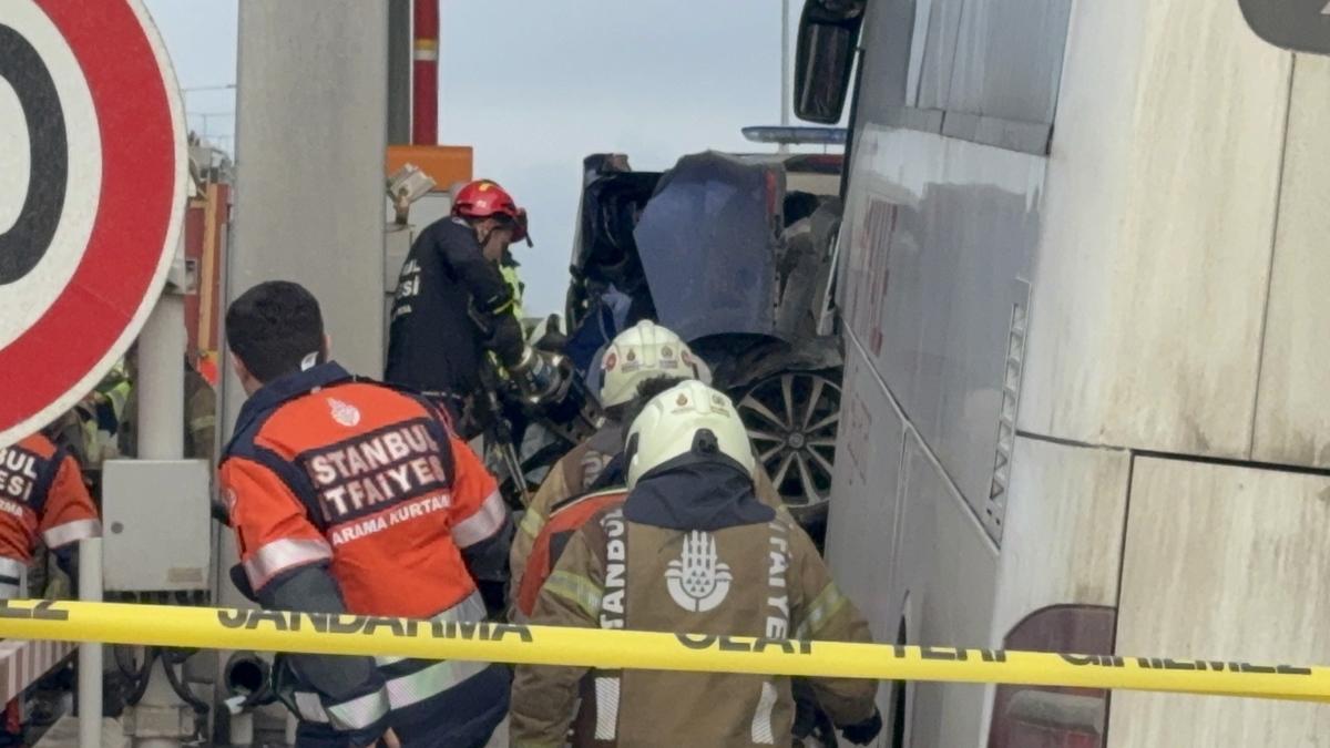İstanbul Silivri Kuzey Marmara Otoyolu Kınalı gişelerinde yolcu otobüsüyle otomobilin çarpıştığı kazada 2 kişi hayatını kaybederken, 1 kişi de yaralandı.