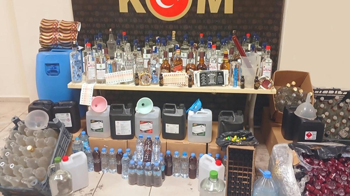 2 iş yeri ile 4 depoda yapılan aramalarda, 3 bin 360 litre etil alkol, alkollü içki yapımında kullanılan 50 aroma kiti, kapak vakumlama makinesi ile 6 cep telefonu ele geçirildi.