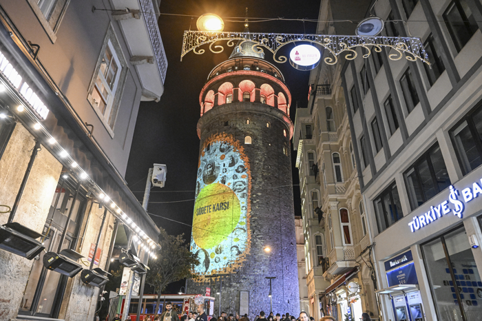 Kadına yönelik şiddete dikkati çekmek için "Şiddete karşı hep birlikte", "Turuncu rozetini tak farkında ol" yazılarının kuleye yansıtıldığı gösteride, hayatını kaybeden kadınların fotoğraflarına da yer verildi.