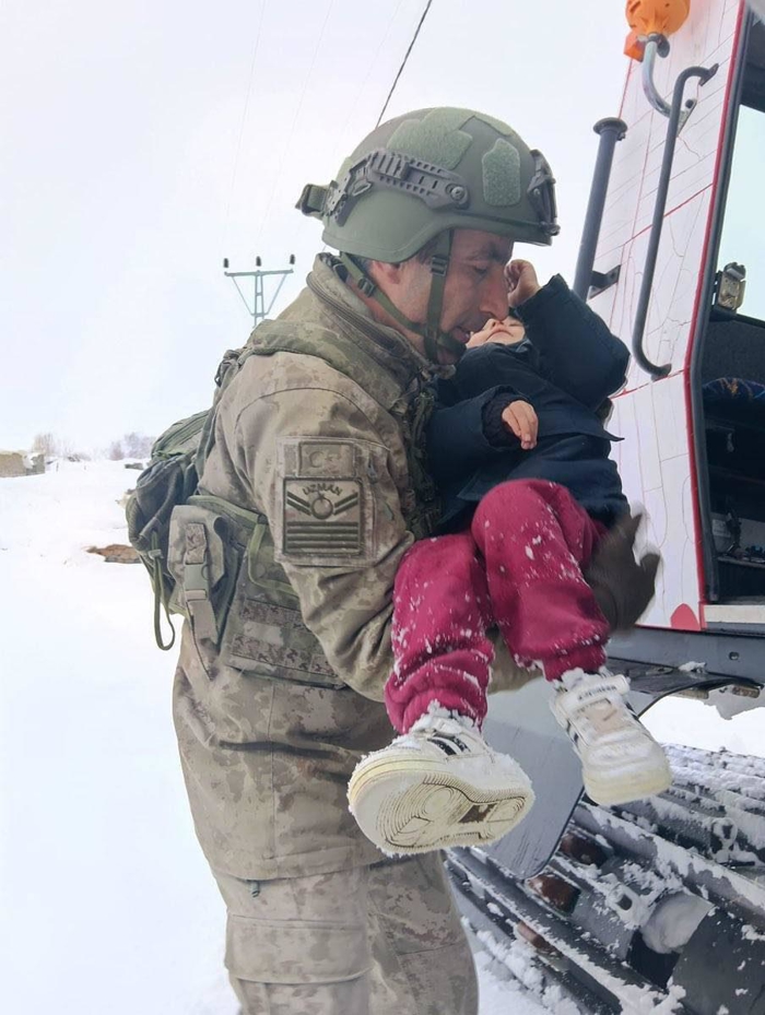 Yolun kalan kısmının tamamen kapalı olması ve tipinin şiddetini artırması üzerine devreye Mehmetçik girdi. Paletli amfibi araçla köye ulaşan Mehmetçik, ateşler içindeki 2 çocuğu evlerinden alarak güvenli bir şekilde bekleyen ambulansa taşıdı.