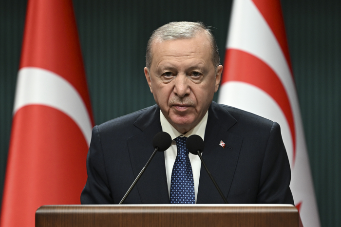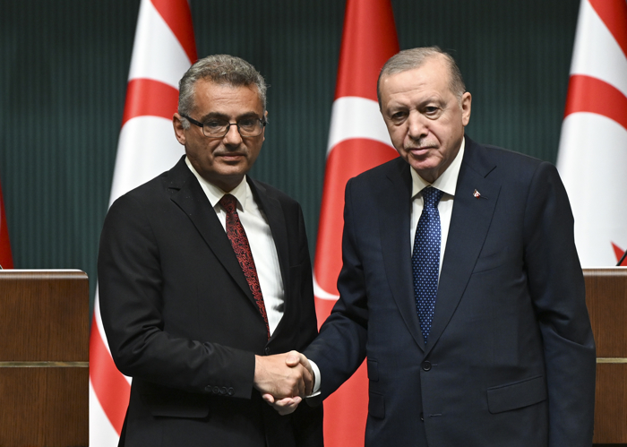Erdoğan, Cumhurbaşkanlığı Külliyesi'nde, baş başa görüşmenin ardından Kuzey Kıbrıs Türk Cumhuriyeti (KKTC) Cumhurbaşkanı Tufan Erhürman ile ortak basın toplantısı düzenledi, soruları cevapladı.