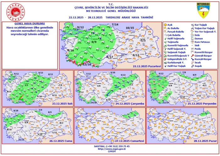 22 Aralık 2025 Pazartesi için Meteoroloji Genel Müdürlüğü tarafından yapılan tahminlere göre: Ülkemiz genelinin parçalı, yer yer çok bulutlu, Güney ve İç Ege, Batı Akdeniz, İç Anadolu, Batı ve Orta Karadeniz ile İstanbul, Kocaeli, Sakarya, Bilecik, Kırklareli'nin kıyı kesimleri ve Balıkesir'in kuzey kesimlerinin aralıklı yağışlı geçeceği tahmin ediliyor. Yağışların, genellikle yağmur ve sağanak, Batı Akdeniz ile Güney Ege kıyılarında yer yer gök gürültülü sağanak, Batı ve Orta Karadeniz'in iç kesimlerinin yüksekleri, İç Anadolu'nun kuzey ve doğusunun yükseklerinde karla karışık yağmur ve yer yer kar şeklinde olması bekleniyor. Yağışların, Antalya çevreleri ile Muğla'nın kıyı kesimlerinde yer yer kuvvetli olacağı tahmin ediliyor. Sabah ve gece saatlerinde kuzey, iç ve doğu kesimlerde buzlanma ve don ile birlikte pus ve yer yer sis bekleniyor.