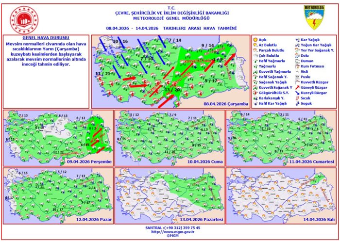 8 Nisan 2026 Çarşamba günü için Meteoroloji Genel Müdürlüğü tarafından yapılan son değerlendirmelere göre: Ülkemiz genelinin çok bulutlu, Ege, Akdeniz, İç Anadolu, Karadeniz, Doğu Anadolu(Van ve Iğdır hariç), Güneydoğu Anadolu ile Balıkesir, Yalova, Bursa, Bilecik ve Sakarya çevrelerinin yağışlı geçeceği tahmin ediliyor. Genellikle yağmur ve sağanak, Batı ve Doğu Karadeniz'in iç kesimlerinin yüksekleri ile Doğu Anadolu'nun yükseklerinde karla karışık yağmur ve yer yer kar şeklinde görülecek olan yağışların; Doğu Akdeniz, Doğu Karadeniz, Doğu Anadolu'nun kuzeyi ile Kayseri, Sivas, Malatya, Muş ve Bingöl çevrelerinde yerel kuvvetli olması bekleniyor. Rüzgarın; Marmara, İç Ege, Batı Karadeniz ve İç Anadolu'nun kuzeybatısında kuzeyli yönlerden, Akdeniz'in doğusu ve iç kesimleri ile İç Anadolu'nun güney ve doğusunda güneyli yönlerden kuvvetli olarak (40-60 km/saat) esmesi bekleniyor. Doğu Karadeniz'in iç kesimleri ile Doğu Anadolu'da yüksek kar örtüsüne sahip eğimli alanlarda çığ ve kar erimesi tehlikesi bulunmaktadır.