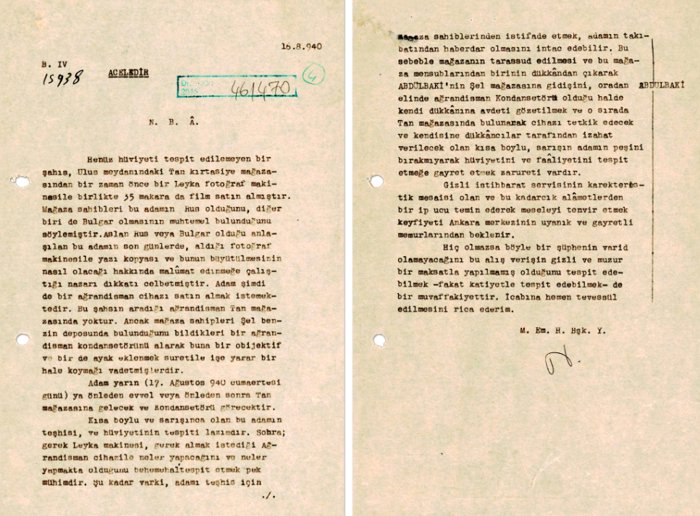 "Henüz hüviyeti tespit edilemeyen bir şahıs, Ulus meydanındaki Tan kırtasiye mağazasından bir zaman önce bir Leyka (Leica) fotoğraf makinesiyle birlikte 35 makara da film satın almıştır. Mağaza sahipleri bu adamın Rus olduğunu, diğer biri de Bulgar olmasının muhtemel bulunduğunu söylemiştir. Aslen Rus veya Bulgar olduğu anlaşılan bu adamın son günlerde, aldığı fotoğraf makinesiyle yazı kopyası ve bunun büyütülmesinin nasıl olacağı hakkında malumat edinmeye çalıştığı nazarı dikkati celbetmiştir. Adam şimdi de bir agrandisman cihazı satın almak istemektedir. Bu şahsın aradığı agrandisman Tan mağazasında yoktur. Ancak mağaza sahipleri Şel (Shell) benzin deposunda bulunduğunu bildikleri bir agrandisman kondansatörünü alarak buna bir objektif ve bir de ayak eklenmek sureti ile işe yarar bir hale koymayı vadetmişlerdir. Adam yarın (17 Ağustos 1940 Cumartesi günü) ya öğleden evvel veya öğleden sonra Tan mağazasına gelecek ve kondansatörü görecektir. Kısa boylu ve sarışınca olan bu adamın teşhisi ve hüviyetinin tespiti lazımdır. Sonra, gerek Leyka makinesi, gerek almak istediği agrandisman cihazı ile neler yapacağını ve neler yapmakta olduğunu behemehal tespit etmek pek mühimdir. Şu kadar ki, adamı teşhis için mağaza sahiplerinden istifade etmek, adamın takibatından haberdar olmasını intaç edebilir. Bu sebeple mağazanın tarassut edilmesi ve bu mağaza mensuplarından birinin dükkandan çıkarak ABDÜLBAKİ'nin Şel (Shell) mağazasına gidişini, oradan ABDULBAKİ elinde agrandisman kondansetörü olduğu halde kendi dükkanına avdeti gözetilmek ve o sırada Tan mağazasında bulunarak cihazı tetkik edecek ve kendisine dükkancılar tarafından izahat verilecek olan kısa boylu, sarışın adamın peşini bırakmayarak hüviyetini ve faaliyetini tespit etmeğe gayret etmek zarureti vardır.