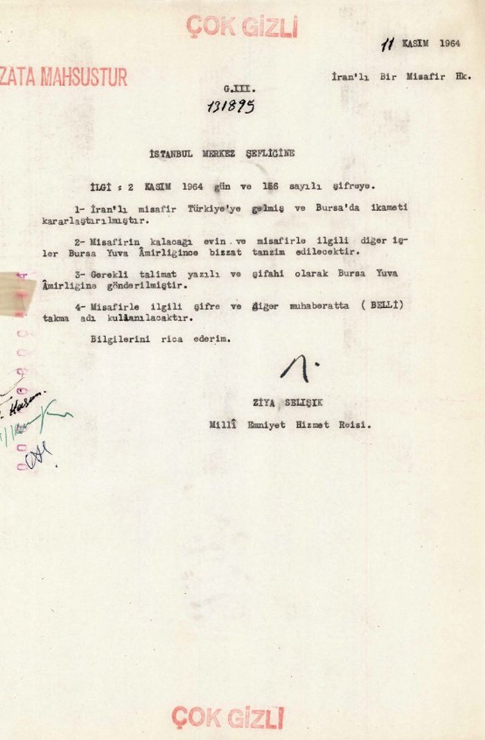 "İranlı misafir Türkiye'ye gelmiş ve Bursa'da ikameti kararlaştırılmıştır. Misafirin kalacağı evin ve misafirle ilgili diğer işler Bursa Yuva Amirliğince bizzat tanzim edilecektir. Gerekli talimat yazılı ve şifahi olarak Bursa Yuva Amirliği'ne gönderilmiştir. Misafirle ilgili şifre ve diğer muhaberatta 'belli' takma adı kullanılacaktır. Bilgilerini rica ederim."