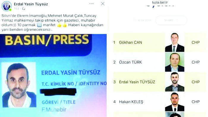 İmamoğlu davasında duruşmalara sahte basın kartıyla girip çektiği görüntüleri sosyal medyadan paylaştığı anlaşılan Erdal Yasin Tüysüz adlı kişinin Tuzla Belediyesi'nde CHP'li Meclis üyesi olduğu ortaya çıktı. Tüysüz için gözaltı kararı verildi.