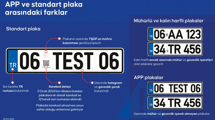 KURALA UYGUNSA KALIN HARF OLABİLİR: Nasıl kimliğimizi güvenliğimiz açısından yalnızca yetkili kurumlar düzenliyorsa, plakaların da aynı şekilde yetkili kurumlarca alınması gerekir. Plakanın üzerinde TŞOF mührü, Sol tarafta TR rumuzu yer almalıdır. hologram, güvenlik şeridi ve tekrar eden kare kutucuklar içinde ay-yıldız ile TR güvenlik işaretleri bulunmaktadır. 1 Ocak 2024'ten itibaren basılan plakalara ayrıca karekod ve 12 haneli seri numarası da eklenmiştir. Plakanın üzerinde yetkili kuruluşun mührü ve diğer güvenlik işaretleri mevcutsa, harf ve rakamlar normal standarda göre biraz daha kalın olsa bile bu plakalar geçerlidir. Standart dışı APP plakalar; radar sistemleri, PTS, KGS ve EDS gibi elektronik denetim altyapıları tarafından sağlıklı biçimde tespit edilememektedir. Bu da ciddi güvenlik açığı ortaya çıkarmaktadır. Burada mesele vatandaşımıza zorluk çıkarmak değil, denetimi sağlıklı yürütmektir.