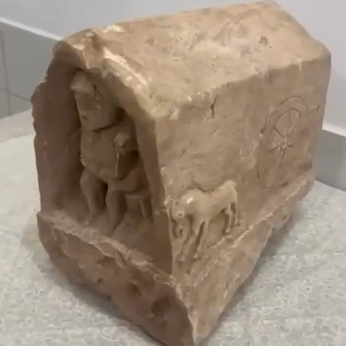 Mezar steli üzerindeki figürler de dikkat çekti. Bir yüzeyinde öne doğru yürüyen bir at figürü ile yanında tekerlek motifi bulunurken, diğer yüzeyde oyuk içerisinde insan tasviri yer alıyor.