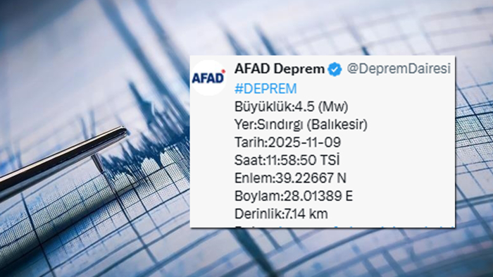 Afet ve Acil Durum Yönetimi Başkanlığının (AFAD) internet sitesinde yer alan bilgiye göre, Balıkesir'in Sındırgı ilçesinde saat 11.58'de 4,5 büyüklüğünde deprem kaydedildi.