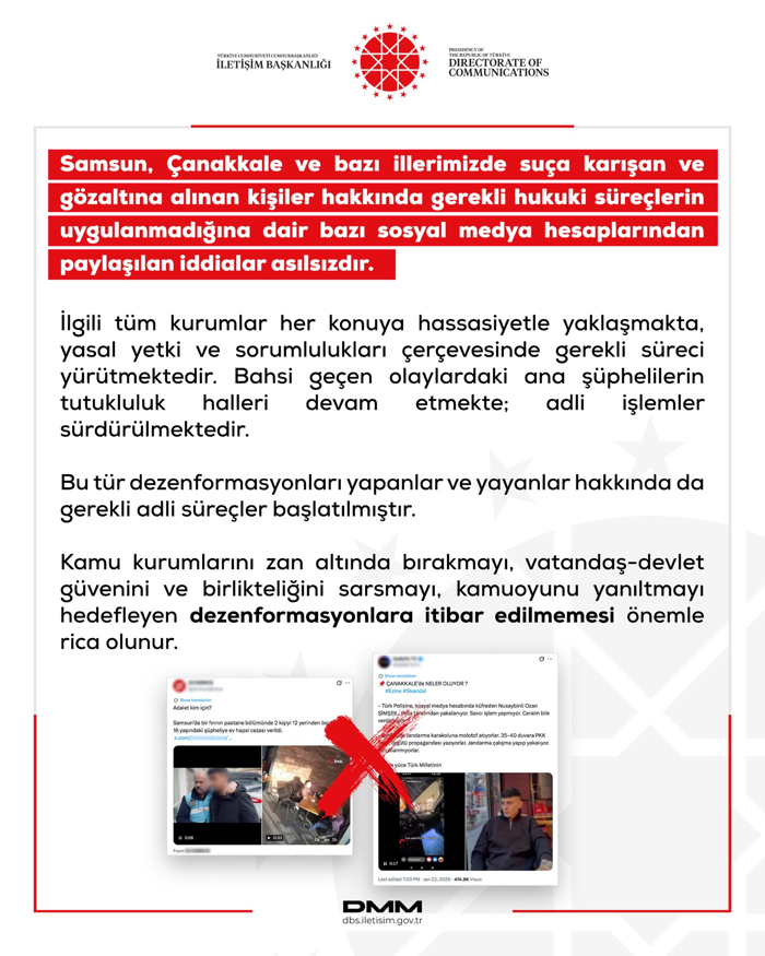 İletişim Başkanlığı Dezenformasyonla Mücadele Merkezince (DMM), Samsun, Çanakkale ve bazı illerde suça karışan ve gözaltına alınan kişiler hakkında gerekli hukuki süreçlerin uygulanmadığına dair iddiaların asılsız olduğu bildirildi.