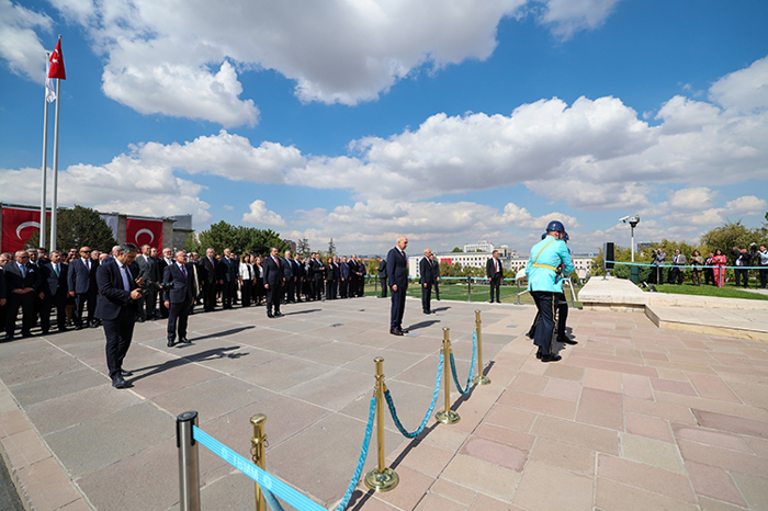 TBMM Başkanı Numan Kurtulmuş'un anıta çelenk bırakmasının ardından bando eşliğinde saygı duruşunda bulunularak, İstiklal Marşı okundu.