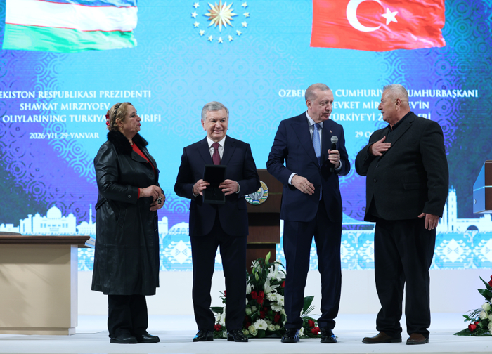 Erdoğan ve Mirziyoyev daha sonra Cumhurbaşkanlığı Külliyesi'nde Hatay'dan gelen 5 depremzede aileye yeni evlerinin anahtarlarını teslim etti.