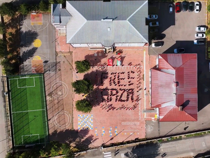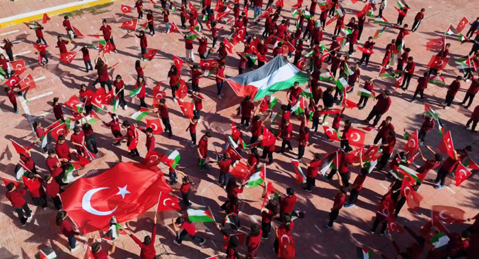 Okul bahçesinde bir araya gelen öğrenciler, İngilizce olarak "Free Gaza" (Özgür Gazze) yazısı oluşturarak Filistin ve Türk bayraklarını dalgalandırdı.