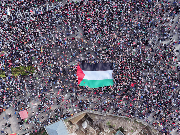 Ellerinde Filistin bayraklarıyla İsrail aleyhine sloganlar atan kalabalık, "Bir adım ötede insanlık ölüyor, kahrolsun İsrail", "Müslümanlar birleşin" yazılı pankartlar taşıyor.