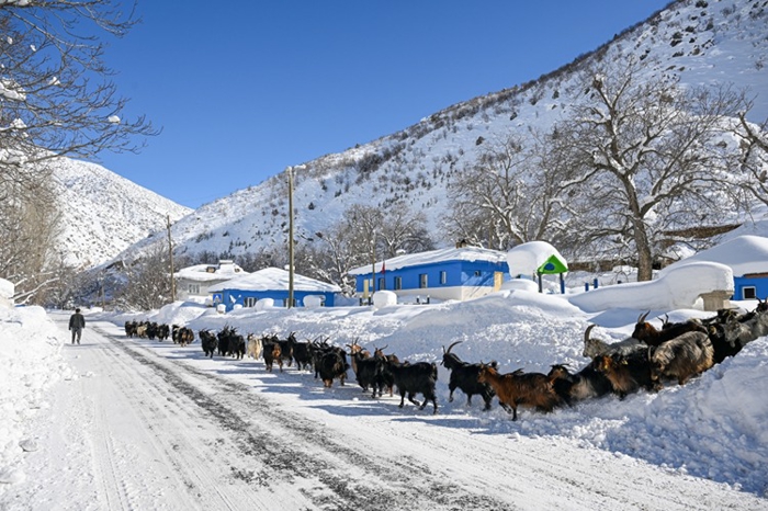 Bazı noktalarda adeta tünel açarak ahırlara ulaşan, saatlerce evlerin çevresindeki karları temizlemekle uğraşan yöre sakinleri, ezdikleri kar örtüsünün üzerinde hayvanlarını yemliyor.