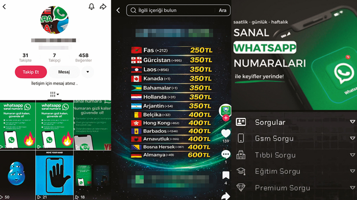 İllegal ağlarda sadece kişisel veriler değil; sahte ve yurt dışı telefon numaraları da satılıyor. Telegram gruplarında 'numara kiralama' ve 'WhatsApp fake numara' başlıkları altında Fas, Almanya, ABD gibi ülkelere ait hatlar 250–600 TL arasında pazarlanıyor. Bu numaralarla kısa süreli iletişim kurulup tehdit mesajları gönderiliyor; ardından hatlar kapatılıyor.