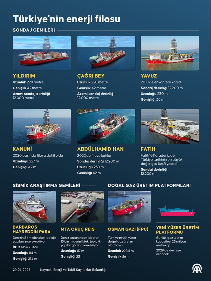 Türkiye, ihtiyaç duyulan doğal gaz ve petrol gibi enerji kaynaklarının teminini yerli imkanlarla sağlamak için son 10 yılda Fatih, Yavuz, Kanuni ve Abdulhamid gibi ileri teknoloji sondaj gemilerinin yanı sıra Barbaros ve Oruç Reis sismik arama gemileriyle güçlü bir enerji filosunu devreye aldı.
