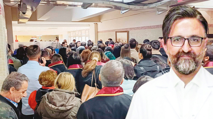 Mahkeme salonunun kapasitesinin yetersiz olması nedeniyle duruşma konferans salonunda görüldü. Ancak yine de kalabalık içeri sığmadı. Mahkeme başkanı, salon şartlarının yetersiz olması sebebiyle TBB Başkanı Erinç Sağkan'ın müşteki avukatlarının bulunduğu sıradan kalkarak izleyiciler kısmına geçmesini istedi. Tepki gösteren avukatlarla mahkeme heyeti tartıştı. Dosyada adı geçmeyen ancak potansiyel mağdur olan çok sayıda ailenin avukatlarıyla baro temsilcileri davaya müdahil olma talebi davanın başlamasını geçiktirdi. Mahkeme heyeti ara vermek zorunda kaldı, salonda 500 kişi olduğu açıklandı.