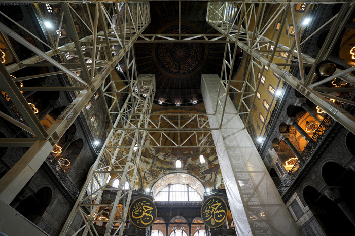 Cami içinde kurulan 43 buçuk metre yüksekliğindeki iskelenin kurulumu için gerekli testlerin yapıldığını söyleyen Kültür ve Turizm Bakanı Mehmet Nuri Ersoy, "Ayasofya Kebir Camii'nin kubbesi, tarihin en muazzam mimari ve mühendislik örneklerinden biri. Buradaki çalışmalarda da her adımı bu bilinçle atıyoruz. Kurşun örtüsünü kaldırırken, iç mekandaki mozaiklerin ve yapının hava şartlarından etkilenmemesi amacıyla geçici çelik çatı ve platform projelerini hazırlattık ve onayını aldık. İç mekanda da çelik platform kurulumunu tamamladık. Tabi bir kez daha altını özellikle çiziyorum; 43,5 metre yüksekliğindeki bu sistemin kurulumu öncesinde zemin testleri, yükleme analizleri, georadar taramaları ve titreşim testleri gerçekleştirdik. Bunların neticesinde verilen olumlu raporların ardından uygulamaya geçtik. Hiçbir işi bilimsel tetkikleri gerçekleştirmeden ve çağdaş restorasyon gereklerini karşılamadan yapmıyoruz" ifadelerini kullandı.