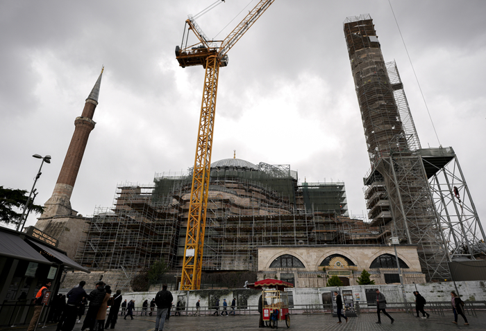 Restorasyon sürecinde 11 bin metrekare iskele kurulumu yapıldığını söyleyen Kültür ve Turizm Bakanı Mehmet Nuri Ersoy, "Ayasofya'nın kuzey, doğu ve güney cepheleri ile minaresinde yaklaşık 11 bin metrekare iskele kurulumu yaptık. Minare altındaki galeri giriş bölgesinde ise çelik platform sistemi oluşturduk. Yaptığımız araştırma raspaları ve malzeme analizleri sonucunda kuzey ve doğu cephelerinde çimento esaslı sıvalar tespit ettik. Yaklaşık 2 bin 800 metrekare alanda titiz bir süreçle bu sıvaları temizledik. Raspası tamamlanan yüzeylerde ayrıca biyolojik oluşum temizliği ve tuzdan arındırma işlemlerini de yaptık. Halihazırda mermer yüzeylerde mekanik temizlik çalışmalarına devam ediyoruz" dedi.