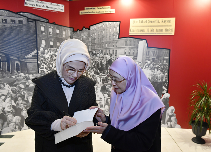Lider eşleri, daha sonra Şule Yüksel Şenler ile Malcolm X'in hak ve özgürlük mücadelesine ışık tutarak miraslarını yaşatmayı amaçlayan "Yankılar: Şule Yüksel Şenler ve Malcolm X'in Mirasını Yaşatmak Sergisi"ni ziyaret etti.