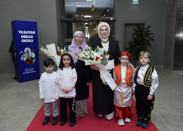 "Resmi ziyaret kapsamında ülkemizde ağırladığımız Malezya Başbakanı'nın değerli eşi Wan Azizah Wan İsmail Hanımefendi ile Cumhurbaşkanlığı Millet Kütüphanemizi ziyaret ettik. Malezya Kitaplığı'nda milletler arasında kalıcı bir düşünce dili kuran kıymetli eserleri birlikte inceledik. Ardından Yankılar: Şule Yüksel Şenler ve Malcolm X'in Mirasını Yaşatmak Sergisi'nde hakikat mücadelesinin coğrafyaları aşan güçlü izlerine tanıklık ettik. Kültür ve Turizm Bakanlığımız tarafından hayata geçirilen Yaşayan Miras Okulu'nda ise kıymetli çocuklarımızla buluştuk. Burada, ebru sanatından çiniye, hat sanatından geleneksel Türk okçuluğuna, Karagöz ile Hacivat'tan Dede Korkut anlatılarına uzanan asırlık mirasımızın çocuklarımızın ilgisiyle, emeğiyle ve merakıyla geleceğe taşındığını görmek mutluluk verici. Bu anlamlı ziyaretin, ortak değerler etrafında güçlenen kalıcı bağlara ilham olmasını temenni ediyorum."