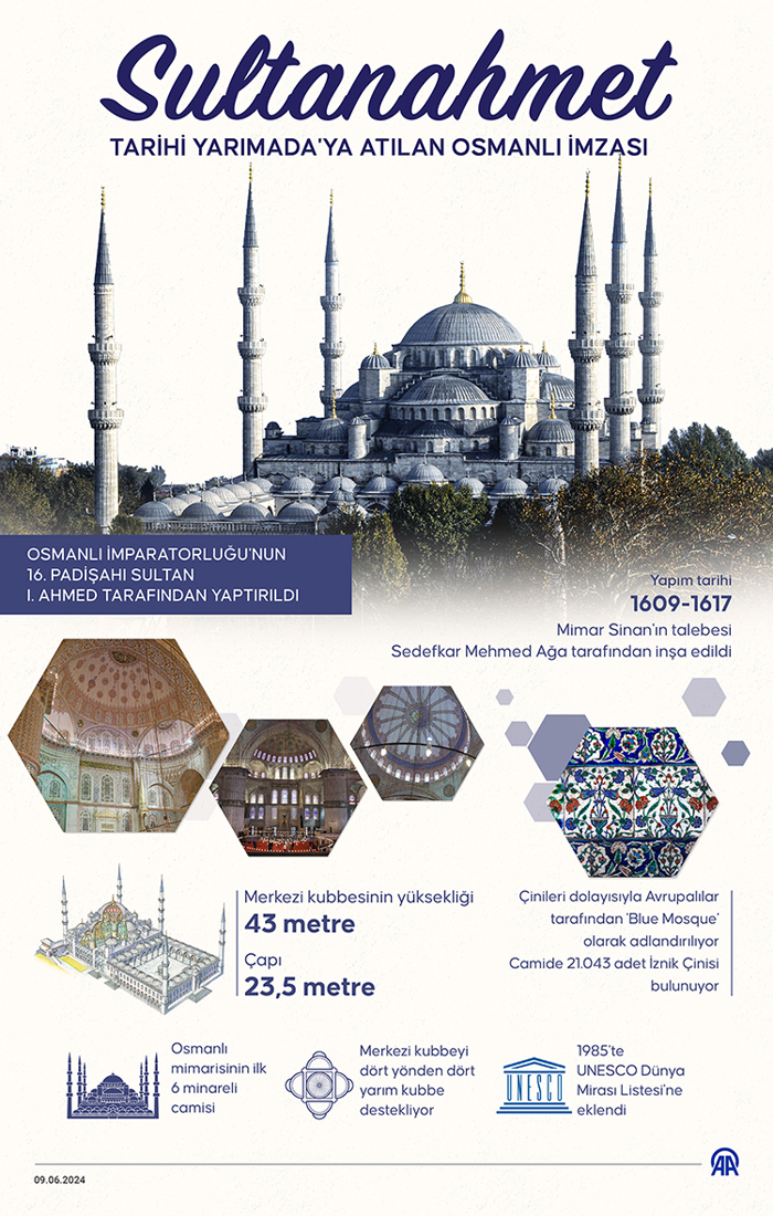 Türk-İslam medeniyetinin en zarif eserlerinden olan ve adeta kente mührünü vuran Sultanahmet Camisi, Osmanlı İmparatorluğu'nun 16. padişahı Sultan 1. Ahmed tarafından Mimar Sinan'ın talebesi Sedefkar Mehmed Ağa'ya inşa ettirildi.