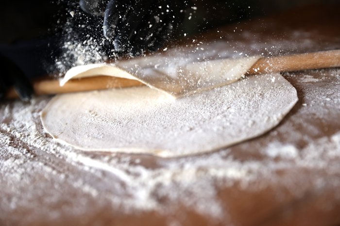 4. Dinlenen hamur 14 eşit bezeye ayırılır, her bezeye nişasta dökülerek çok ince açılır ve kızan sacın üzerinde pişirilir.