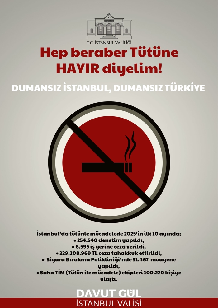 "İstanbul İl Sağlık Müdürlüğü tarafından ilimizde tütünle mücadelede 1 Ocak-20 Ekim 2025 tarihleri arasında, 254 bin 540 denetim yapıldı. 6 bin 595 iş yerine ceza verildi, 229 milyon 208 bin 969 lira ceza tahakkuk ettirildi. 41 Sigara Bırakma Polikliniğinde, 31 bin 467 muayene yapıldı. 18 bin 385 kişi ilaç, 12 bin 258 kişi danışmanlık desteği aldı. Saha TİM (Tütün ile mücadele) ekipleri ise 100 bin 220 kişiye ulaştı. Sizler de tütün ürününü bırakmak için ALO 171 Sigara Bırakma Danışma Hattı ve sigara bırakma poliklinikleri aracılığıyla destek alabilirsiniz."