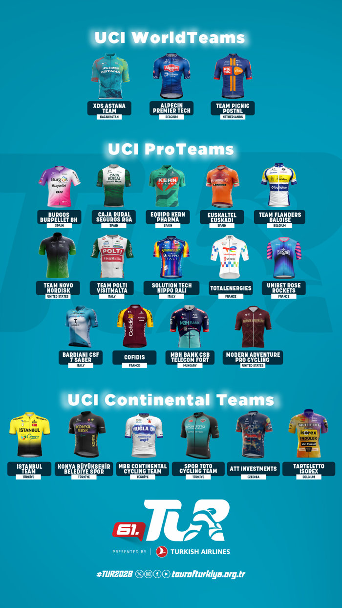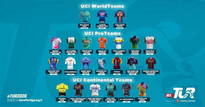 TUR 2026'da 3 WorldTeam, 14 ProTeam, 6 Continental Team kategorisinde toplam 23 UCI Takım ve 27 farklı ülkeden 161 sporcu mücadele edecek. TUR 2026'da mücadele edecek takımlar arasında Türkiye'yi temsil eden 4 Kıta Takımı yer alıyor.