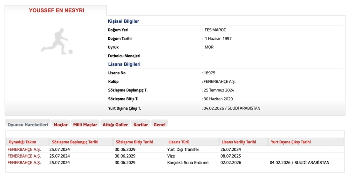 Fenerbahçe, Faslı santrfor Youssef En-Nesyri ile sözleşmenin feshedildiğini Türkiye Futbol Federasyonu'na bildirdi. Oyuncunun Suudi Arabistan'a transfer olduğu detaylarda yer aldı.