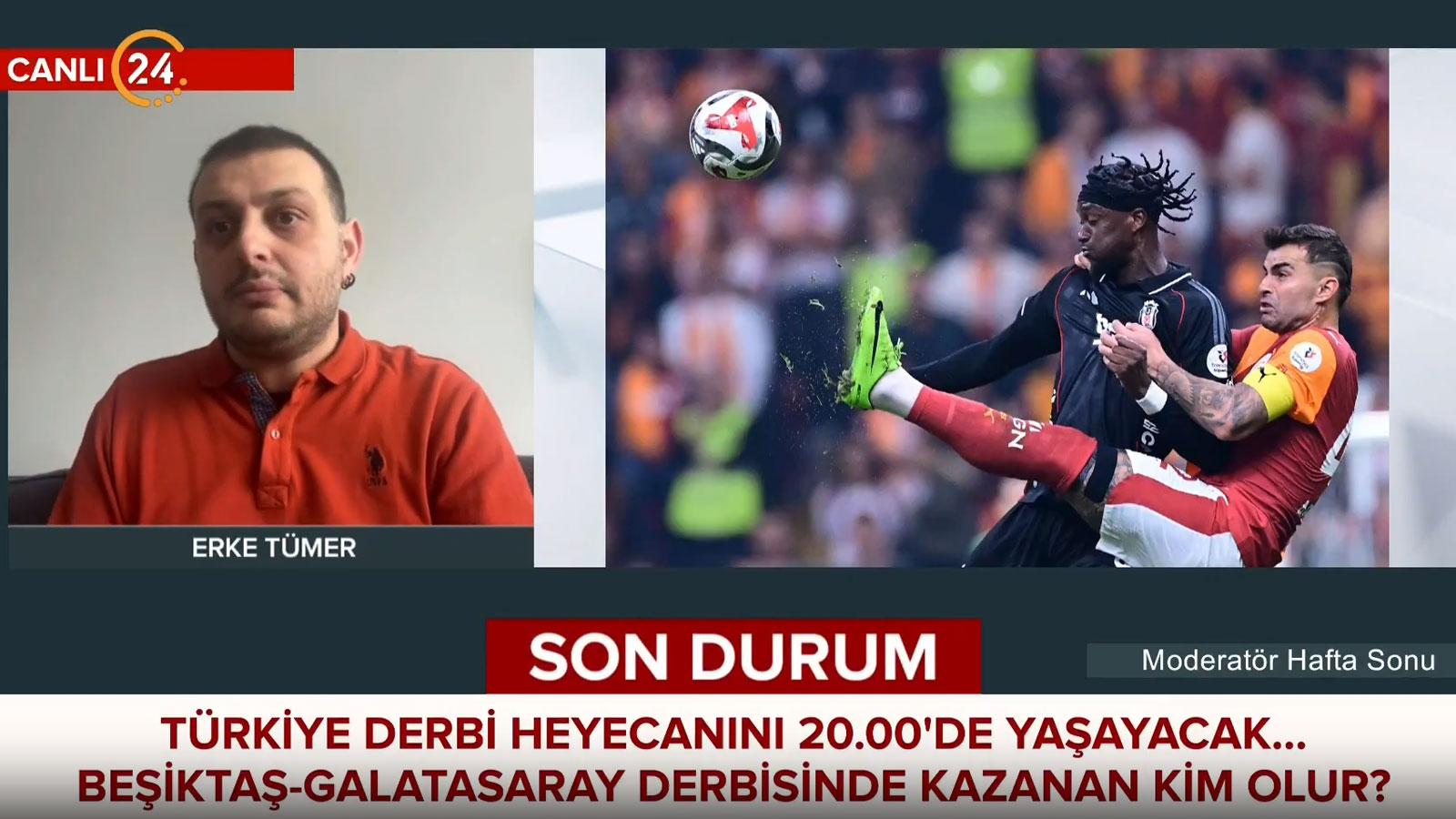 Süper Lig'in 25. haftasında oynanacak Beşiktaş–Galatasaray derbisi öncesi iki takımın form durumu ve istatistikleri dikkat çekiyor. Lig Radyo Programcısı Erke Tümer 24 TV'de katıldığı moderatör hafta sonu programında oynanacak dev derbiye dair değerlendirmede bulundu.