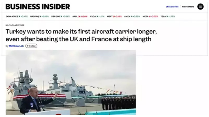 ABD merkezli Business Insider, Türkiye'nin ilk uçak gemisi projesindeki kapsamlı revizyonu gündemine taşıdı. Uzunluğunun 300 metreye çıkarılması planlanan geminin, tamamlandığında Türkiye'yi NATO içinde İngiltere ve Fransa'nın önüne geçirebileceği vurgulandı. Analizde proje, “Türk Kalesi” nitelemesiyle dikkat çekti.
