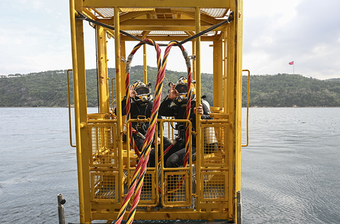Kıyafetlerini giyinen, oksijen tüpleri ve başlıklarını takan dalgıçlar, ekibin yardımıyla asansöre benzeyen dalış steycine binerek komutla suya indirildi.