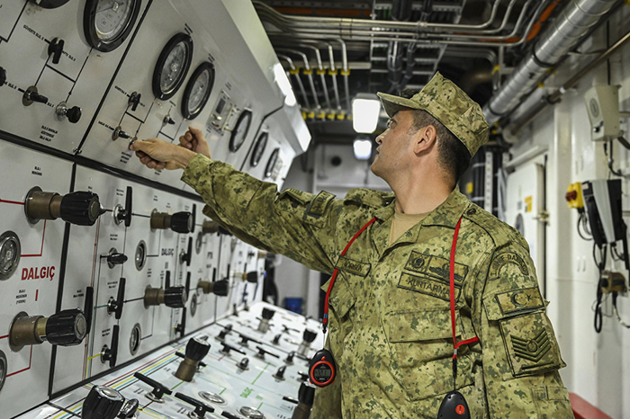 Boğazdaki genel eğitim faaliyetinde vardiya subayının komutlarıyla limandan hareket eden gemi, dalış eğitimlerini icra etmek için suya açıldı.