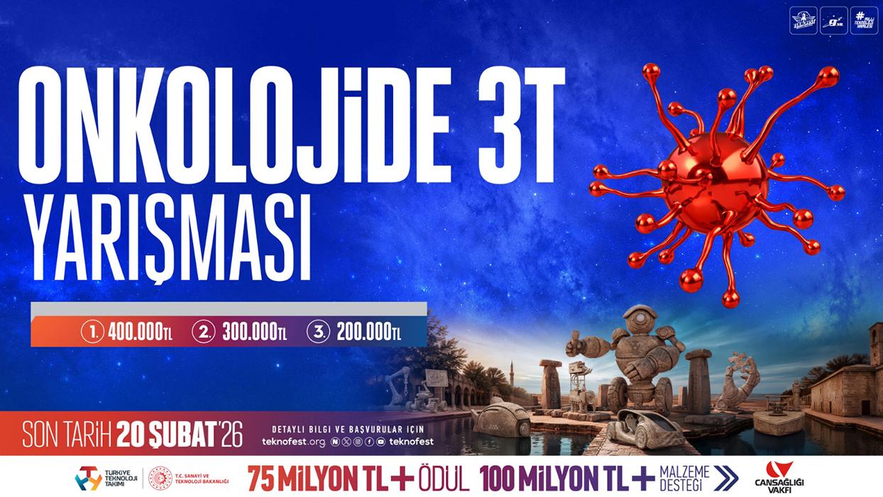 TEKNOFEST 2026 Teknoloji Yarışmaları kapsamında gerçekleştirilecek "Onkolojide 3T Yarışması" genetik mühendisliği, biyoteknoloji ve yapay zeka gibi ileri teknolojileri onkolojik problemlere uyarlayan projeleri bir araya getiriyor. Onkolojide 3T Yarışması'na başvurular 20 Şubat tarihine kadar devam ediyor.