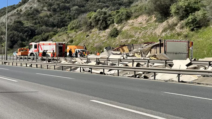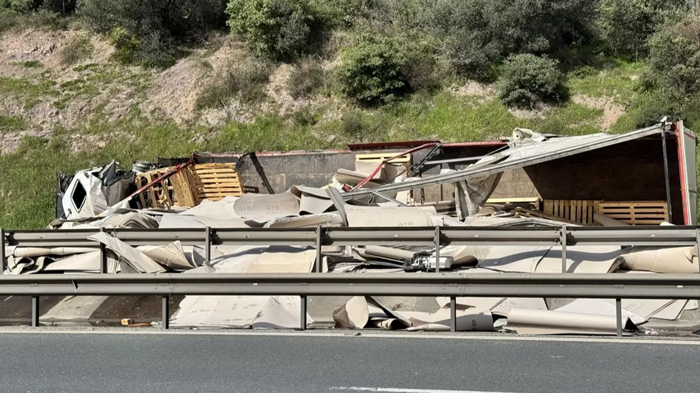 Kaza sonucu mukavva yüklü tır devrildi. Tırdaki mukavvalar yola saçıldı.