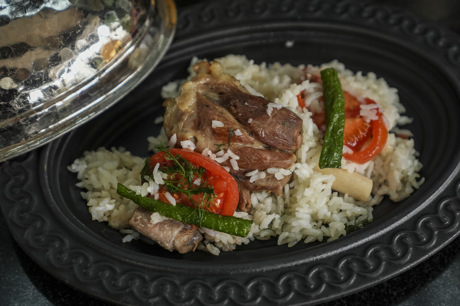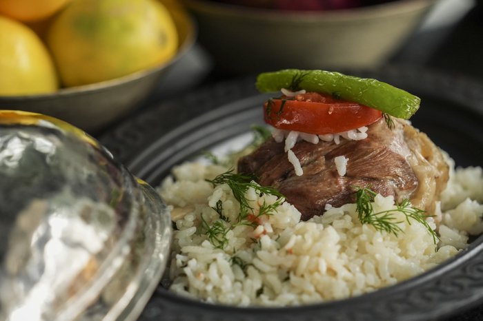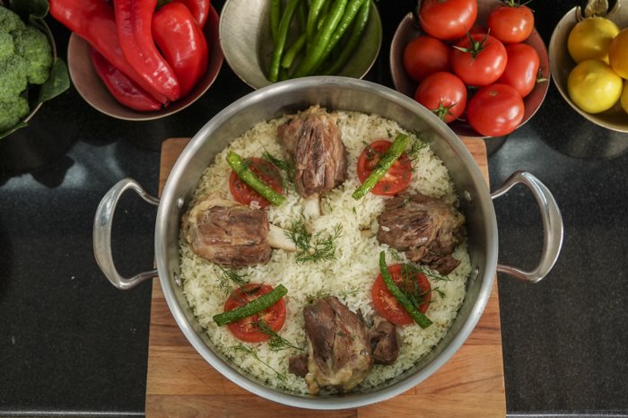 5. Suyunu çeken pirincin üzerine kuzu incikler, domates ve biber konulup fırında pişirilir.