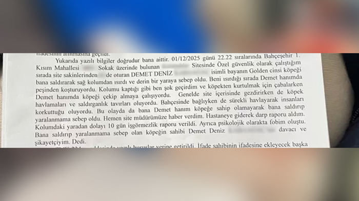 Güvenlik görevlisi Semih Anıl Cansız'ın babası İbrahim Cansız yaşanan olayı anlatarak, "Olay 1 Aralık'ta saat 22.30 sıralarında oldu. Oğlum Başakşehir'de bir sitenin güvenlik görevlisi. Site yönetiminin önünden ihtiyaç molası için giderken site sakininin Golden cinsi köpeği ağzı açık bir şekilde gezdirirken arasında mesafe olmasına rağmen çocuğa saldırıyor. Saat 00.00 gibi haberim oldu. Esenyurt Devlet Hastanesi'ne getirildi. Oradan Başakşehir Çam ve Sakura Şehir Hastanesi'ne sevk edildi. Kolundan kapmış. Kolundaki kesik yaklaşık 4,5 santim. Kemiğe kadar. Altlarında diş izleri var. Kolun alt tarafından kapsa tamamen kasları koparacak. Site, güvenlikli bir site. Nasıl oluyor da bu saldırgan köpekleri serbest bırakabiliyorlar? Hastanede işlemleri bittikten sonra emniyet güçlerine şikayette bulunduk. Şu anda hemen hemen her gün hastaneye götürüyoruz. Pansuman için. Bu site sakini hakkında davacıyız. Sonuna kadar gideceğiz" dedi.